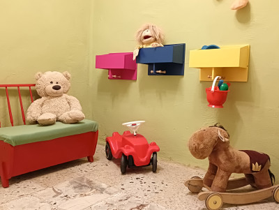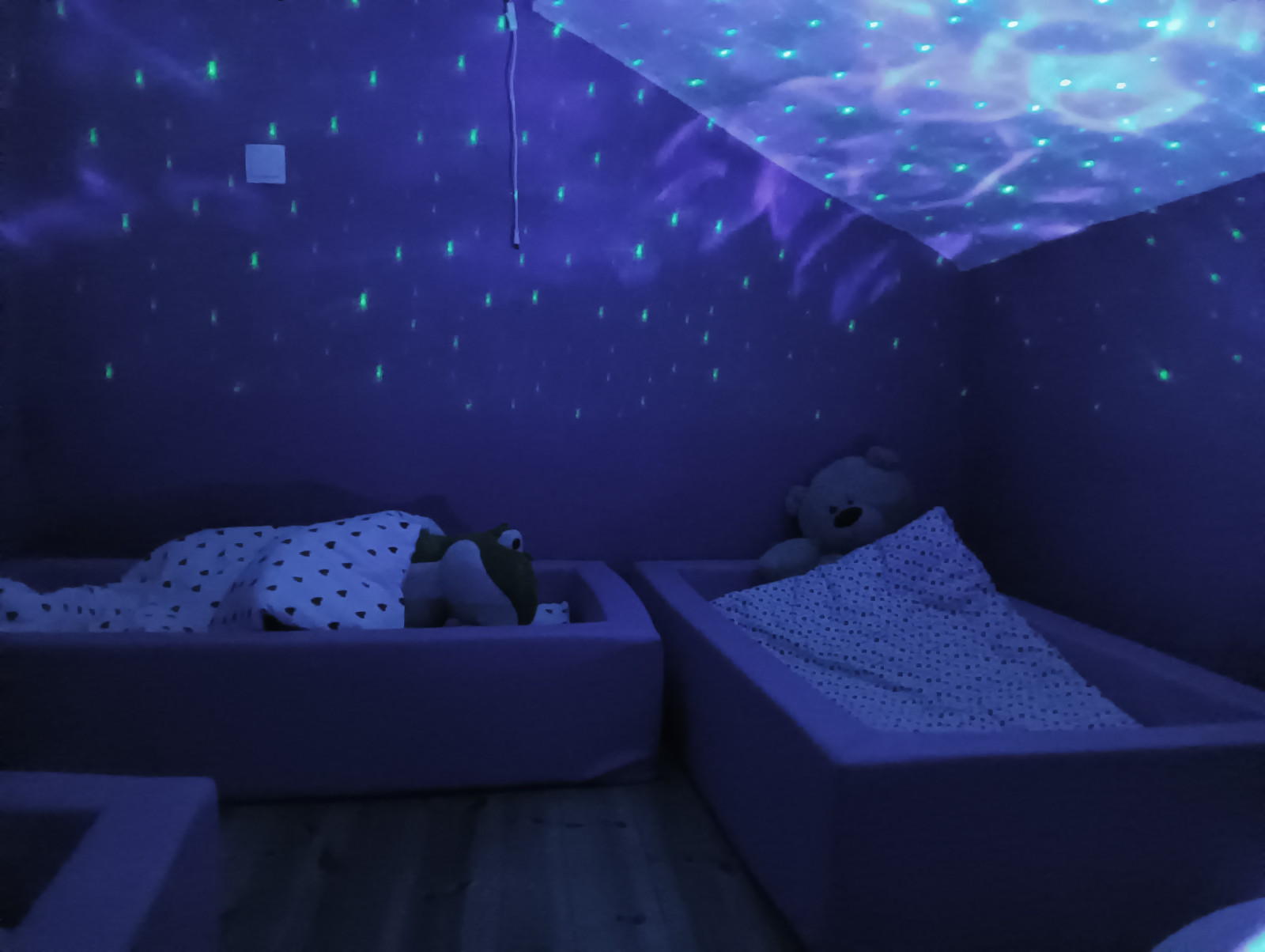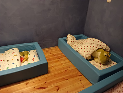 Kinder haben besondere Bedürfnisse an die Einrichtung: Für den Mittagsschlaf oder um sich auszuruhen gibt es den Schlafbereich mit einem eigenen Bettchen für jedes Kind. Die Mahlzeiten lassen wir uns an einer altersgerechten Sitzgruppe schmecken. Wir haben viel Platz zum spielen, basteln und toben, sowohl drinnen als auch im Garten.